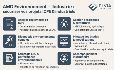 L’AMO Environnement pour le secteur industriel exige une maîtrise fine des réglementations ICPE, des enjeux de risques industriels, de la gestion des effluents, des émissions atmosphériques et de l’intégration des exigences ESG des grands groupes.