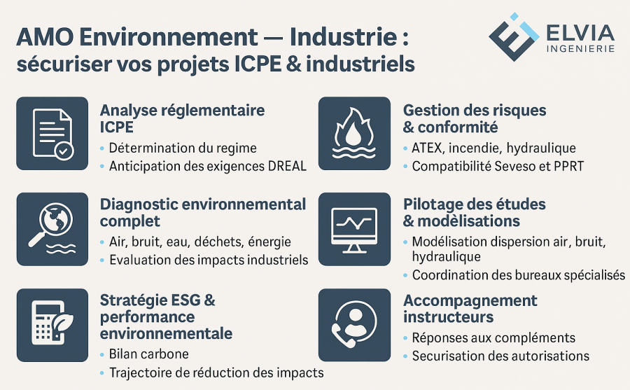 Elvia Ingénierie intervient auprès d’industriels de toutes tailles (sites Seveso, logisticiens, agroalimentaire, chimie, énergie, pharmaceutique) pour sécuriser leurs projets d’extension, de réhabilitation ou de mise en conformité environnementale.