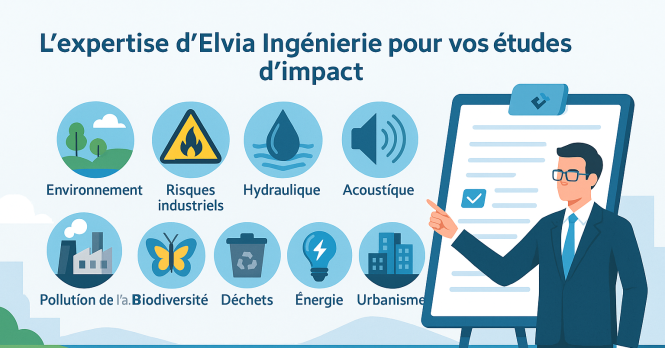 Elvia Ingénierie réalise des études d’impact ICPE depuis de nombreuses années pour des industriels, aménageurs, collectivités et porteurs de projets. Notre force repose sur une approche pluridisciplinaire intégrant environnement, risques industriels, hydraulique, acoustique, pollution de l’air, biodiversité, déchets, énergie et urbanisme.