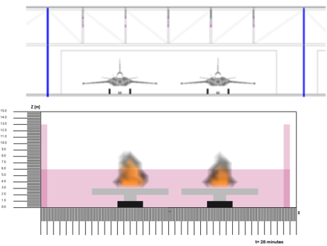 Afin d’anticiper les effets thermiques et dynamiques d’un incendie dans une alvéole ou un atelier, Elvia a réalisé des modélisations précises sous FDS (Fire Dynamics Simulator), évaluant la propagation des flammes et des fumées, notamment en cas d'incendie sur un appareil ou des composants pyrotechniques. Le dimensionnement des murs coupe-feu, l’intégration de fusibles thermiques, et la mise en place de systèmes de désenfumage et de fermeture des vannes (asservies au SSI) ont été définis selon la norme APSAD R16.