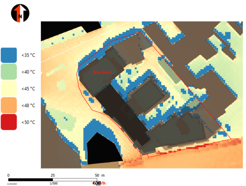 Modélisation des effets thermiques liés à l’imperméabilisation des sols et à la morphologie urbaine. Analyse des apports du projet en termes de végétalisation et d’adaptation climatique.