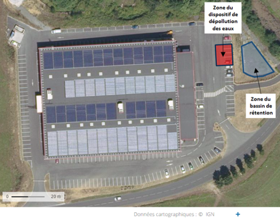 Enfin, nous avons défini et dimensionné les équipements de traitement des eaux pluviales collectées sur les zones à risque (parkings, voiries, aires de stockage) :