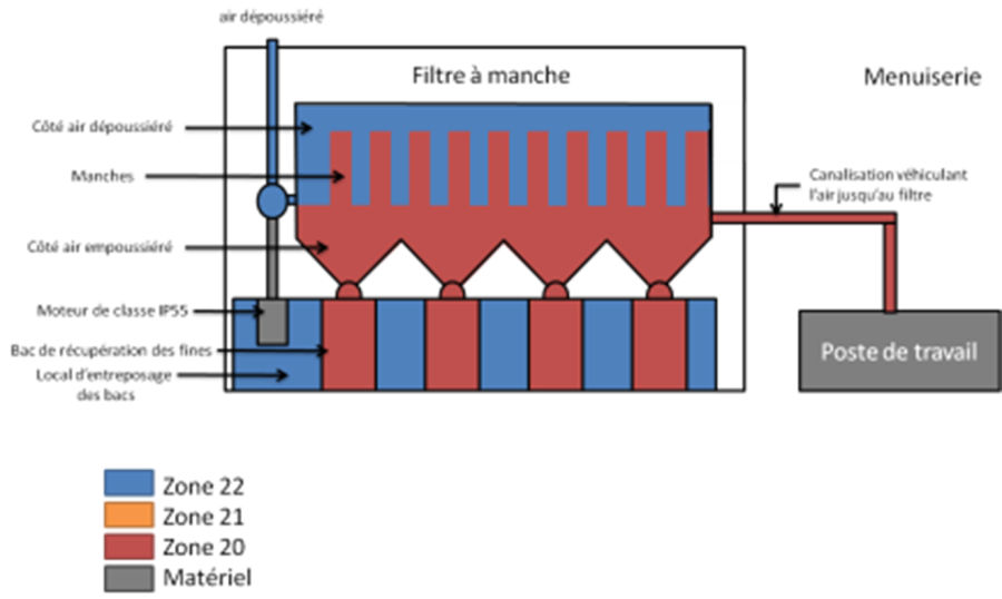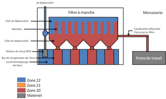 La mission a débuté par une analyse approfondie des procédés et des équipements utilisés, en particulier la présence d’un filtre à manche, source potentielle d’atmosphères explosives liées aux poussières de bois.